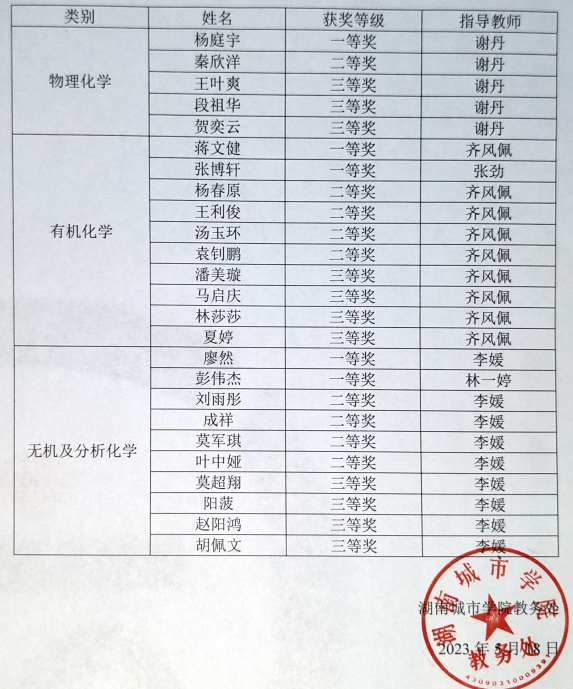 为迎接2023年7月在湖南科技公司举办的湖南省老员工化学化工学科竞赛,按照省赛模式,beats365于5月15日晚举行了初试(理论考试),共80名同学参加。根据初试成绩,33位同学进入复试(实验考试),复试于5月17日下午进行,最终25名同学获得相应奖项,获奖名单如下: