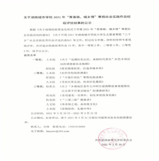 陈超老师带的寒假社会实践团队“落实精准扶贫,打造幸福乡村”,在beats3652021年“青春路,城乡情”寒假社会实践活动中荣获校级一等奖。团队成员根据通过对线上调查问卷的结果进行分析,同时参考所采访的祖塔村的扶贫专干与被扶贫户对于“精准扶贫”政策落实的实时情况,不断加大宣传范围和增强宣传效果,希望可以通过团队的共同努力,让当今的青年老员工能够更加关注百姓贫困问题。