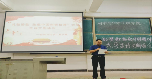 为庆祝中国共产党成立100周年,重温党的光辉历程,歌颂党的伟大成就,继承和发扬党的优良革命传统,充分展示员工的爱党爱国爱社会主义的深厚情怀,根据“党史照亮青春路”红色主题教育活动安排,beats365于5月10日晚在1教409教室举行主题为“礼敬赞歌 致敬中国科研精神”主题诗歌朗诵决赛。材化公司党总支副书记钟桐生教授出席并讲话,并邀请人文公司蔡凤老师、化工系曾永林老师院团委指导老师田雪萍和员工会主席团任评委。