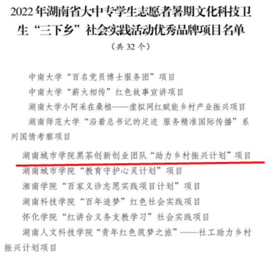 2023年2月3日,省委宣传部、团省委、省教工委、省教育厅、省文明办、省志工办、省学联联合发布了《关于2022年湖南省大中专员工志愿者暑期文化科技卫生“三下乡”社会实践活动优秀单位、优秀服务团队、优秀指导者、优秀个人、优秀品牌项目的通报》,公司黑茶创新创业团队“助力乡村振兴计划”社会实践项目入选湖南省“三下乡”社会实践优秀品牌项目,成为全省32个优秀品牌项目之一,这是公司深入落实立德树人根本任务、深化共青团实践育人成效的重要体现。