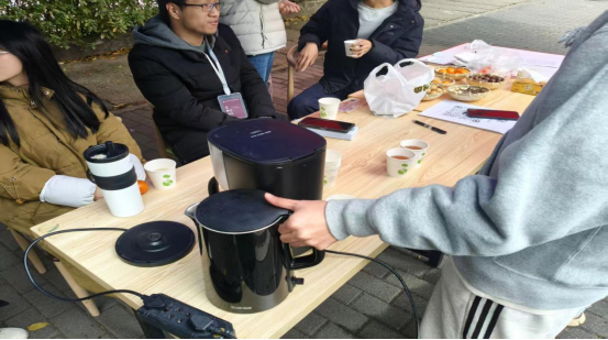 本次活动以无门槛、轻互动形式面向全校师生开放,活动现场搭建起两顶帐篷作为简易茶歇区,热水壶、排插等设备一应俱全。茶艺社社员化身“暖心茶艺使者”,主动为路过师生递上暖心茶饮;茶歇区桌面摆放果切、坚果等零食,师生可自由取用、随意落座,围绕年度趣事、当下烦恼及新年计划展开自由交流,在氤氲茶香中放松身心、舒缓压力。