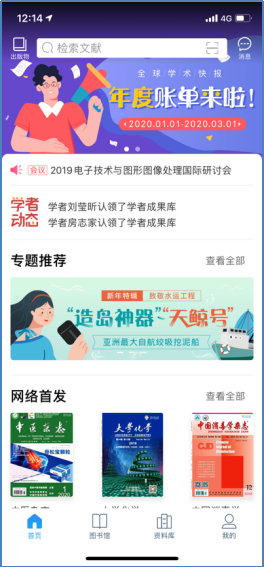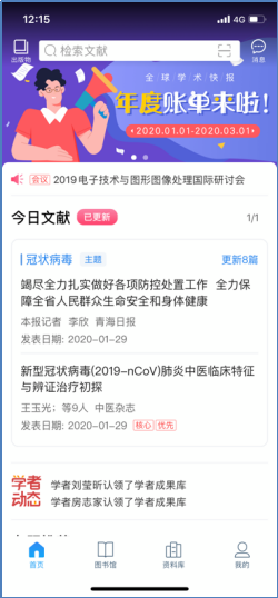如果您想了解疫情的最新研究成果,不妨定制一个“冠状病毒”专题。只需点击首页下方的“图书馆”,再点击页面上的“+”号按钮,选择“主题”定制,在检索框中输入“冠状病毒”点击“定制”按钮即可完成。每日将有最新的相关文献成果推送到您的首页(如图4所示)。