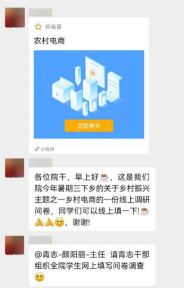 团队成员通过在QQ群、微信群分享调查问卷的方式,向各年级员工或亲朋好友咨询有关农村电商的看法和意见。