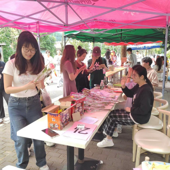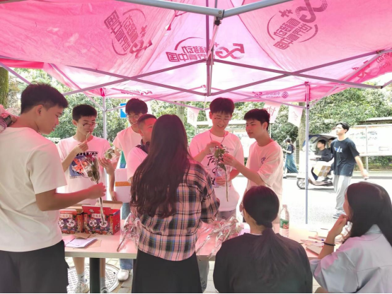 结合了寻宝和环保两个元素,意味着整个活动不仅是一场寻找宝藏的冒险,更是一场环保知识的学习和实践。活动开始前,环保协会成员在摆台以及附近藏好装有问题的小信封和奖品,很多同学被摆台桌上的鲜花吸引过来了,纷纷参与进来在附近寻找起信封来,很多同学寻到小信封返回摆台处开始答题。有的同学胸有成竹正确回答问题,而有的同学则是看着问题眉头紧皱抓耳挠腮,成功兑换奖品的同学们兴高采烈的离开,直到摆台结束。