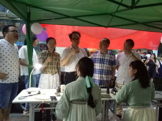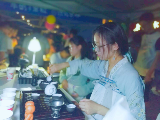 夜幕微降,新食堂摆台区域坐着三位身穿汉服的员工茶艺师,他们伴随着现场由主办方提供的音响所播放的婉转悠扬、绵远缥缈的中国古典音乐沏茶斟茶,举手投足皆是优美,技艺手法不尽娴熟,现场画面美好和谐处处展现了本次茶艺活动的主题。随后,材化公司党总支书记王彬、副经理刘长辉、副书记王传浩,辅导员徐晨曦、陈艳姣莅临活动现场,并对活动进行了指导。在现场,领导和老师观看了员工茶艺师的茶艺表演,并品尝了员工们沏的茶,还同活动中的员工交流了黑茶制作工艺和茶艺精髓历史。此次活动还安排了书法展示等各种调节心理情绪的小游戏,让员工们在课余时间积极参与到社团活动来,建设健康的员工心理,通过品茗来陶冶情操、净化心灵。