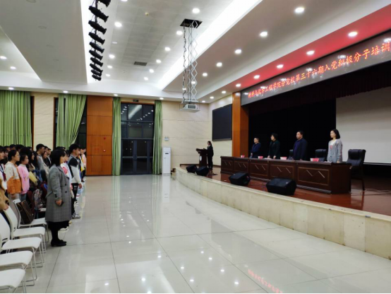 庄严雄壮的国歌响起,开班典礼正式开始。首先,由石清丽同志作培训动员讲话。她对参与培训的全体学员表示祝贺,并对学员们提出三点期望:端正态度,正确认识参加入党积极分子培训的重要意义 ;明确目标,努力提高入党积极分子培训学习效果 ;严格要求,积极认真圆满完成本次培训学习任务 。随后,学员代表1808101班楼航同学发言,代表学员们表达了向党组织靠拢的决心与信心。最后陈艳姣同志宣读了培训纪律。开班典礼在庄严肃穆的国际歌歌声中落下帷幕。