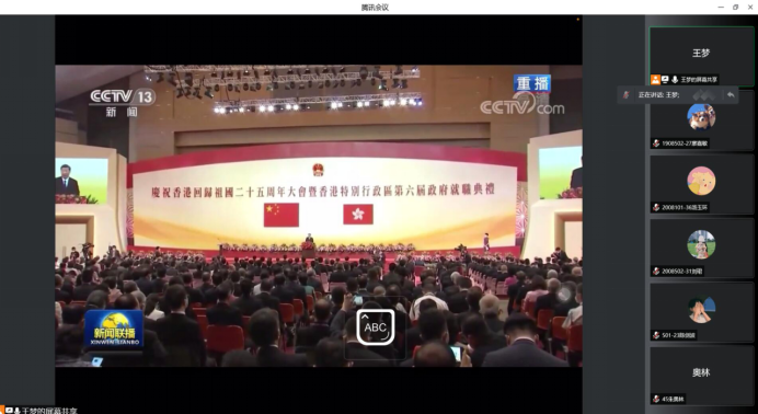 会上,王梦同志带领大家学习了习近平总书记在庆祝香港回归祖国25周年大会上的重要讲话精神。其中,陈亚洁同志谈到:“香港的回归推进了祖国的统一大业。祖国为香港遮风挡雨,而香港也是祖国不可或缺的一部分。”