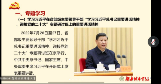 会上,贺雨西同志带领大家学习了习近平总书记在省部级主要领导干部“学习习近平总书记重要重要讲话精神,迎接党的二十大”专题研讨班上的重要讲话精神。其中,贺雨西同志谈到:“高举中国特色社会主义伟大旗帜,奋力谱写全面建设社会主义现代化强国的新篇章。”