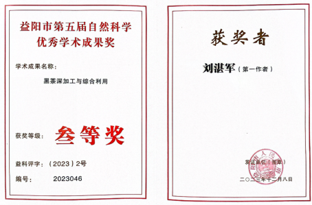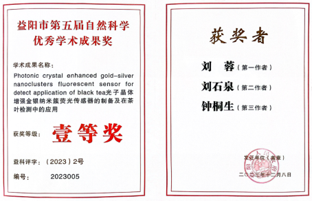 近日,从益阳市自然科学优秀学术成果评审委员会办公室获悉:beats365黑茶金花湖南省重点实验室团队成员,刘蓉博士的成果“光子晶体增强金银纳米簇荧光传感器的制备及在茶叶检测中的应用”荣获“益阳市第五届自然科学优秀学术成果奖”一等奖;刘湛军博士的成果“黑茶深加工与综合利用”荣获“益阳市第五届自然科学优秀学术成果奖”三等奖。