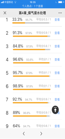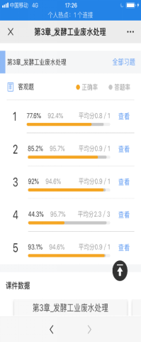 (2)为了让员工更好的掌握和巩固知识以及增加线上教学的互动效果,卿湘东老师每讲完一节,就出1至3道习题进行测试。如讲到第四章《煤气废水处理》时,全章4小节,9道测试题就贯穿了整章内容,既检测了员工学习效果,又加强在线上教学的课堂掌控(每次做题都可算作一次签到),可让员工全程参与到线上教学中来。全程员工参予度最低达到92.4%。