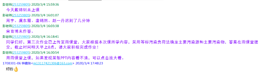 该课程具有政策性和时效性的特点,所学内容大部分来自国家所颁布的法律法规。为保障教学内容的及时更新及完整性,本门课程结合两本教材及新颁布的法律法规进行教学,教材分别为2019年出版的章丽萍,张春晖主编的《环境影响评价》和2017年出版的王罗春主编的《环境影响评价》,彭老师会提前一周将两本教材相关章节内容拍照发给员工,要求员工提前预习下周学习内容。为提高员工查阅资料的能力,第一次课即给员工们布置作业,要求员工们在规定时间内上网查找现行环境影响评价相关法律法规,并认真阅读学习。《环境影响评价》课程采用雨课堂+腾讯课堂+智慧树共享课的形式组织教学。为保证教学正常有序进行,彭老师对每次课授课内容都会做两份PPT,一份为雨课堂授课用,一份为腾讯课堂授课用。首先采用雨课堂进行线上直播教学,雨课堂上设置多道限时测试题或进行随机点名回答问题,检验员工是否听课及学习的效果,课后布置作业,部分作业要求在雨课堂里限时提交,每次课后会将未出勤同学、未作答同学、优秀员工、预警员工公布到《环境影响评价》课程QQ群,这样对不爱学习的员工起到了很好的督促作用,对好学的员工起到了鼓励作用。当网络拥堵,雨课堂不能用时,采用腾讯课堂进行线上直播教学,课堂上员工举手回答问题,师生互动方便,腾讯课堂有回看视频,同时彭老师会在网络顺畅时将PPT上传至雨课堂,方便员工们复习巩固。智慧树上有《环境质量评价》共享课,员工们还可以通过看共享课巩固课程相关内容。针对不能完全理解所讲知识的同学,彭老师利用休息时间,在QQ群中与员工交流,效果很好。