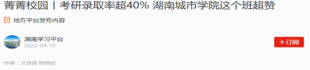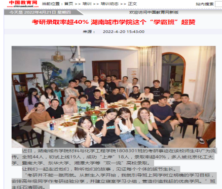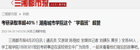 题记:在今年2022届毕业生考研工作中,beats365共有197人参考,考研初试上线86人,目前预录取80人,其中1808301班考研共有18人成功“上岸”。公司网站对此事迹报道后,引起了中国教育网、学习强国、新浪网、湖南日报新媒体客户端、湖南教育、红网、三湘都市报、腾讯网、网易网、搜狐网、益阳日报等近十余家媒体专题跟踪报道,在高校和社会上产生强烈反响,现摘录如下: