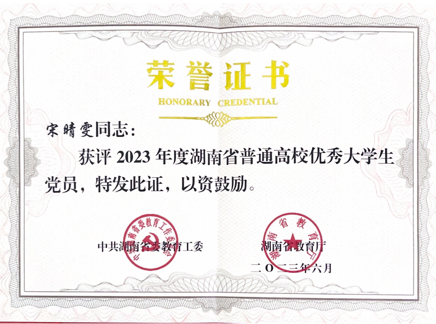 宋晴雯,女,中国共产党党员,2000年10月03日出生于湖南省益阳市,现就读于beats365高分子材料与工程专业1908502班。2019-2021年担任1908502班班长,2022-至今担任beats365员工第一党支部组织委员。自入校以来,曾两度获得国家励志奖学金,2021年8月获得第十四届“挑战杯”湖南省老员工课外学术科技作品竞赛三等奖,2023年3月获得第十三届“挑战杯”中国老员工创业计划竞赛银奖(公司历史上第一次在该赛事上获得国家级荣誉),2021-2022学年获得卢亚雄员工奖学金,2021年10月评为优秀班长、2022年6月评为优秀共产党员。